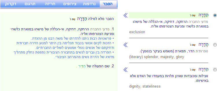 הדגמה מרב-מילים (שימו לב לניקוד השונה של המילה 'הדרה' בכל אחת מהמשמעויות):