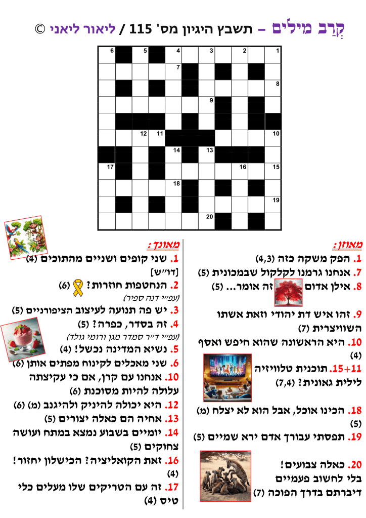 את פתרון תשבץ ההיגיון ניתן לשלוח בדוא"ל: ravmilim@melingo.com או בדואר לכתובת: מלינגו בע"מ, תוצרת הארץ 16, תל אביב. יש לציין את שם התשבץ ומספרו, ישתתפו בהגרלה רק פתרונות שיגיעו לצוות רב-מילים תוך 10 ימים מיום פרסום התשבץ (01/09/2024 הוא מועד הפרסום – 10/09/2024 הוא המועד האחרון לשליחת תשובות).