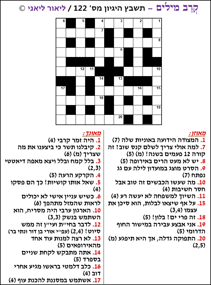 את פתרון תשבץ ההיגיון ניתן לשלוח בדוא"ל: ravmilim@melingo.com או בדואר לכתובת: מלינגו בע"מ, תוצרת הארץ 16, תל אביב. יש לציין את שם התשבץ ומספרו, ישתתפו בהגרלה רק פתרונות שיגיעו לצוות רב-מילים תוך 10 ימים מיום פרסום התשבץ (06/04/2025 הוא מועד הפרסום – 16/04/2025 הוא המועד האחרון לשליחת תשובות).