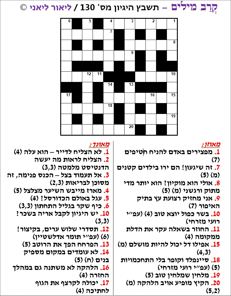את פתרון תשבץ ההיגיון ניתן לשלוח בדוא"ל: ravmilim@melingo.com או בדואר לכתובת: מלינגו בע"מ, תוצרת הארץ 16, תל אביב. יש לציין את שם התשבץ ומספרו, ישתתפו בהגרלה רק פתרונות שיגיעו לצוות רב-מילים תוך 15 ימים מיום פרסום התשבץ (05/02/2026 הוא מועד הפרסום – 20/02/2026 הוא המועד האחרון לשליחת תשובות). שלחו לנו את התשובות שלכם!